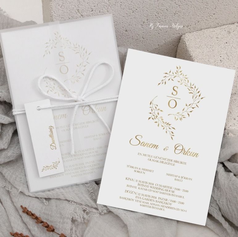 Altın varaklı, monogram detaylı sade davetiye modeli