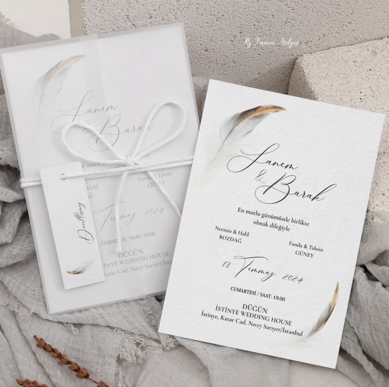Tüy detaylı, bohem, sade davetiye modeli