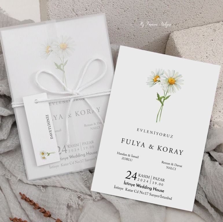 - Sade davetiye, minimal tasarımıyla yazı ve grafik detayların net şekilde öne çıkmasını sağlar.