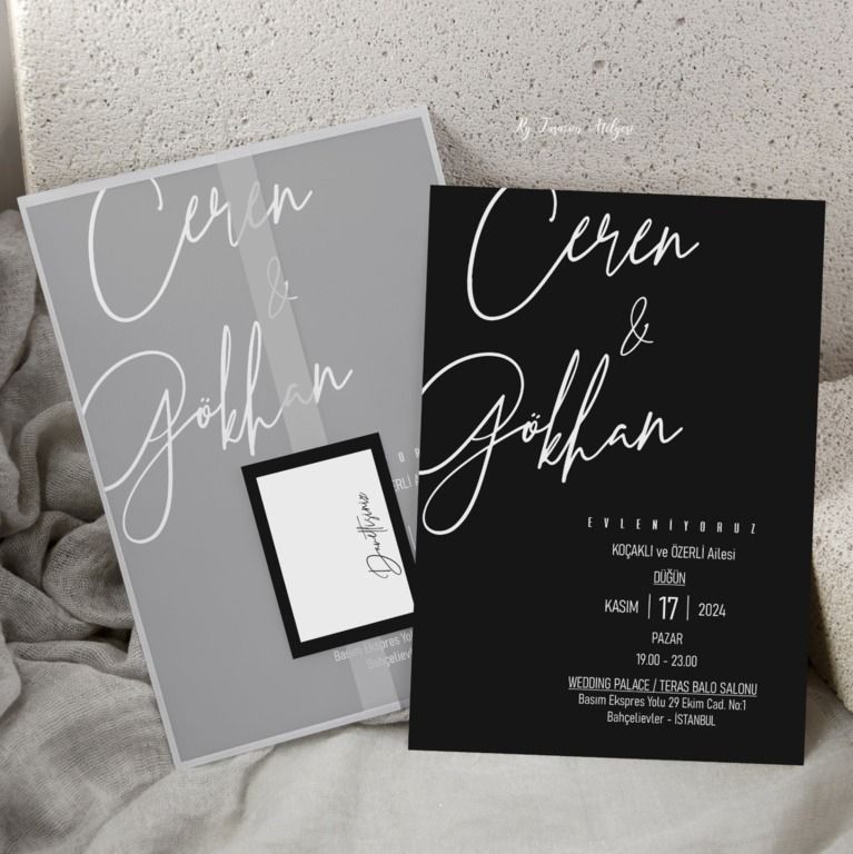 - Sade davetiye, minimal tasarımıyla yazı ve grafik detayların net şekilde öne çıkmasını sağlar.