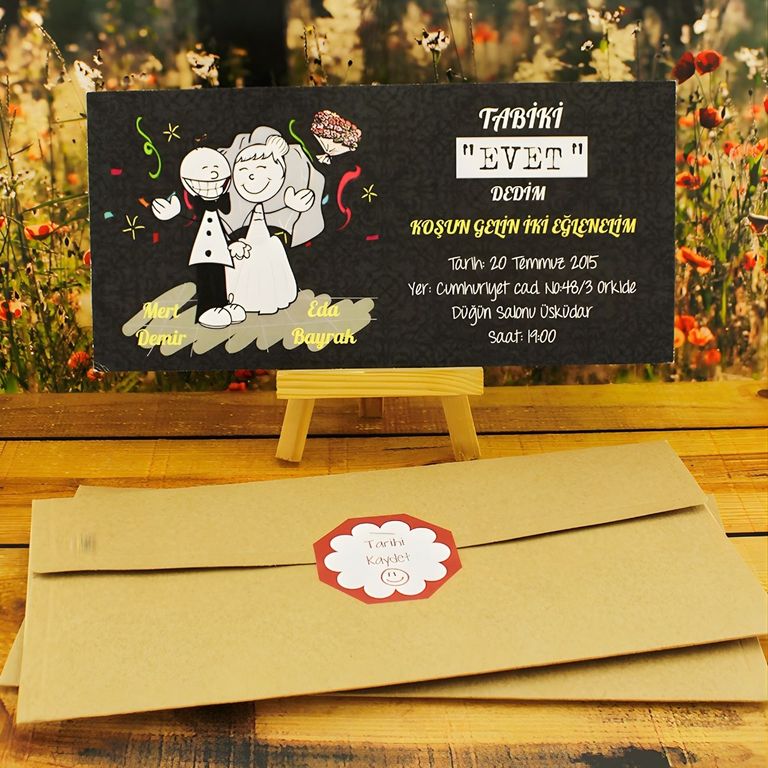 - Karikatürlü davetiye, çifte özel çizimleriyle davet sürecine eğlenceli ve özgün bir karakter kazandırır.