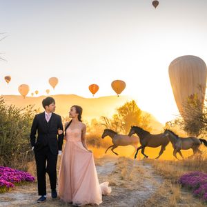 "Çekimlerimizi Kapadokya ve çevresinde; vadiler, at çiftlikleri, yılkı atları, tarihi manastırlar, kilim dükkânları ile açık ve kapalı mekânlarda gerçekleştiriyoruz. Mevsime, ışığa ve çiftimizin beklentilerine göre lokasyonları birlikte belirliyoruz. Standart paketimiz; 4 lokasyon çekimi, tüm dijital teslimler, drone fotoğrafı, drone ile hazırlanmış reels video ve 35 fotoğrafta profesyonel Photoshop işlemlerini içerir. Paket dışındaki tüm hizmetler isteğe bağlı olarak ekstra eklenebilir; dileyen çiftlerimiz yalnızca standart paketle de çekim yaptırabilir."