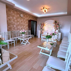 Davetlilerinizin konforlu bir şekilde oturmaları için birçok farklı tarzda masa ve sandalye temini yapıyoruz. Masa ve sandalyeleri ya da düğün mekanınızı dekoratif ögelerle süslüyoruz. Narin ve saf sevginin temsili papatyalarla, aşkın ve tutkunun güçlü ifadesi güllerle ortamı donatıyoruz. Yemekli davetlerinizde, yiyecek ve içeceklerin hazırlanma sürecini iş birliği içerisinde olduğumuz firmayla gerçekleştiriyoruz.