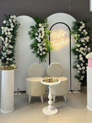 Minimalist yaklaşım ile oluşturulan dekorlar, şaşaalı konseptlerden ziyade modern, sade ve şık estetik anlayışıyla hayata geçirilmiş. Nişan taklarında beyaz tonların vurgulandığı ve çiçeklerle donatıldığı bir görsellik hakim. Sütunlar üzerinde kollu şamdanların ve çiçeklerin yer aldığı düzenlemede romantizm öne çıkıyor. Üzerinde led aydınlatmaların bulunduğu fon kumaşlarının renklerini çiftler belirliyor.