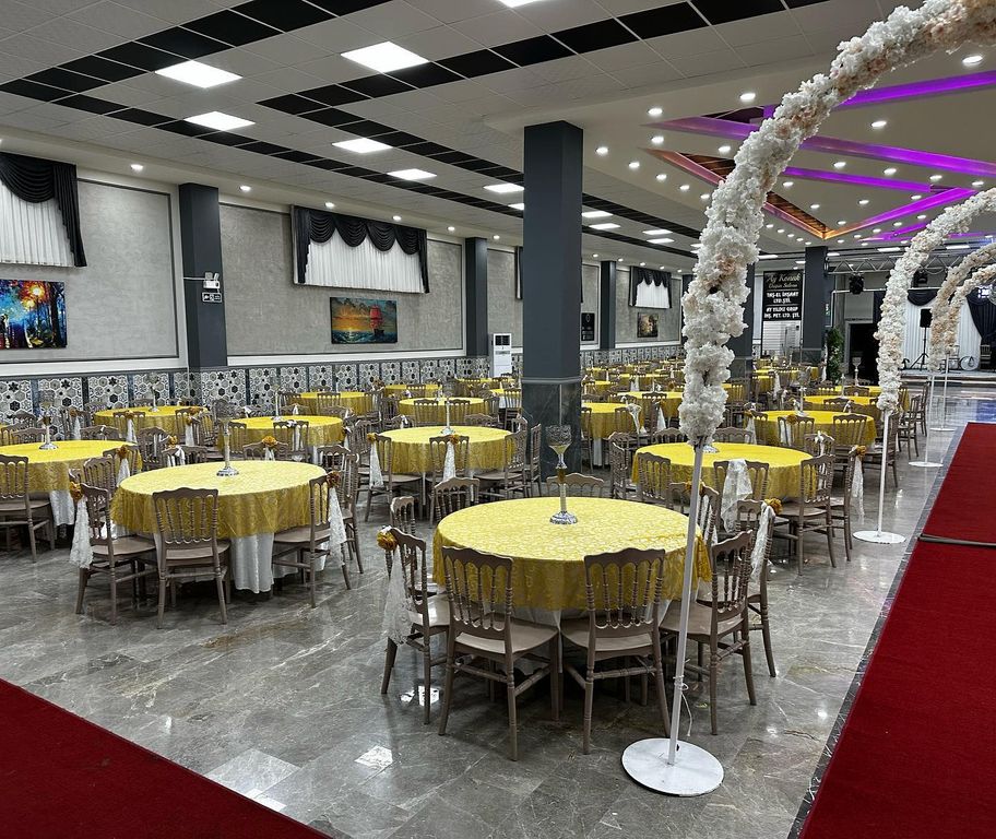 Mekan, yüksek tavanlı ve kolonsuz yapıya sahip geniş kapalı salon alanları sunuyor. Yuvarlak masa düzenleriyle hazırlanan davet alanı, kalabalık organizasyonlarda dahi rahat bir kullanım sağlıyor. Sahne ve oturma alanları dengeli şekilde konumlandırılıyor. Aykonak & Yıldız Vadi Düğün Salonları’nın geniş iç mekan planlaması sayesinde misafirlerin hareket alanı korunuyor ve organizasyon akışı düzenli şekilde ilerliyor.