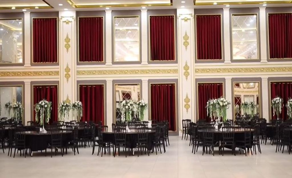Batman düğün salonlarından olan mekanda ihtişamlı ve klasik detaylar belirgin şekilde öne çıkıyor. Salon duvarlarında kullanılan altın varaklı süslemeler ve bordo perdeler, mekana saray atmosferi kazandırıyor. Yuvarlak masalar siyah tonlarda sandalyelerle hazırlanırken, masaların üzerinde yer alan yüksek çiçek aranjmanları düzenli bir görünüm oluşturuyor. Sahne bölümünde gold tonlu mobilyalar, beyaz tül fonlar ve zarif çiçek süslemeleri dikkat çekiyor.