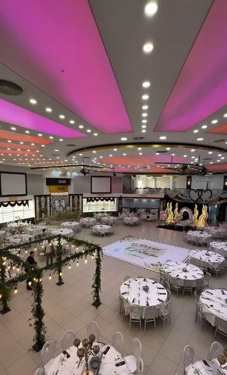 Batman düğün salonu seçeneklerinden olan mekanın dekorasyonunda geniş ve ferah bir düzen öne çıkıyor. Sahne bölümünde gold tonlarda detaylara sahip arka plan panelleri, kalp formlu platform ve alev formundaki dekoratif objeler dikkat çekiyor. Geniş dans pisti, ortada konumlanarak salonun merkezinde net bir alan oluşturuyor. Tavanda yer alan oval ve dairesel formlu led aydınlatmalar, farklı renk geçişleriyle mekana hareket katıyor.