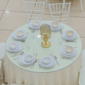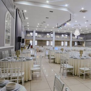 Salonumuzda krem ve gri tonlarının uyumu, sade ama etkileyici bir atmosfer oluşturuyor. Bu soft renk paleti, hem modern hem de romantik konseptlerle mükemmel bir uyum yakalıyor. Seramik zemin dokusu mekana ferahlık ve ışıltı kazandırırken; zarif detaylarla tamamlanan beyaz Tiffany sandalyeler ve krem masa örtüleri şıklığın en doğal halini yansıtıyor.