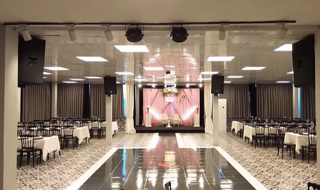 Mekanın dekorasyonunda siyah, beyaz ve gri tonlar ağırlıklı olarak kullanılıyor. Yuvarlak ve dikdörtgen masalar beyaz masa örtüleriyle tamamlanırken, siyah sandalyeler modern bir kontrast oluşturuyor. Desenli zemin kaplaması mekana hareket katarken, sahne alanında soft renkli fon ve ışık detayları tercih ediliyor. Aydınlatma sistemiyle desteklenen bu düzen, Kahramanmaraş düğün salonları içinde sade ve düzenli bir dekorasyon anlayışı sunuyor.