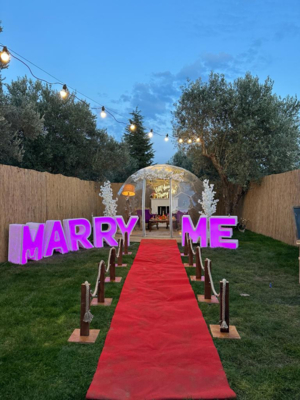 İzmir'de evlilik teklifi organizasyonu denilince akıllara gelen ilk firmalar arasında yer alan Pırlanta Organizasyon, düşlediğiniz teklifi hayata geçirmede oldukça donanımlı. Bungalov ev konseptiyle şarap ya da şampanya kadehlerini tokuşturarak, meyve veya çerez tabaklarıyla donatılmış rustik dekorlu masalarda atıştırarak ve çok daha fazla özelliğin yer aldığı hizmetlerinden faydalanabilirsiniz. Cam fanus temasıyla volkan gösterilerinin, meşalelerin, mumların saçtığı romantik alevler eşliğinde evlilik teklifi etmek de mümkün.