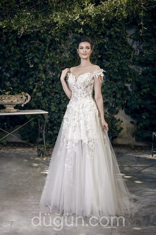 Düşük omuz, üst bedeni transparan, üç boyutlu çiçeklerle hareketlendirilmiş, eteği tül gelinlik