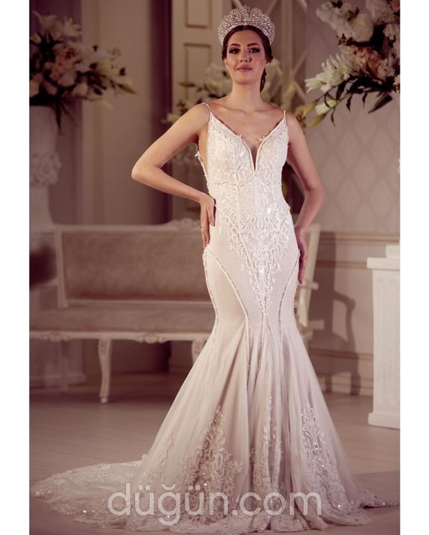 İnce askılı, V yakalı, dantel işlemeli, kristal detaylı, balık kesim gelinlik