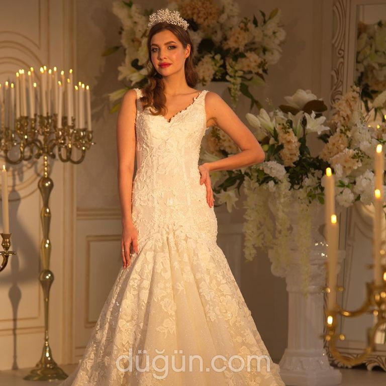 Askılı, V yakalı, yarım balık kesim, kristal boncuk ve üç boyutlu işlemeli, dantelli, ön kısmı daha sade dantel ve üç boyutlu çiçeklerle süslemeli kuyruklu gelinlik
