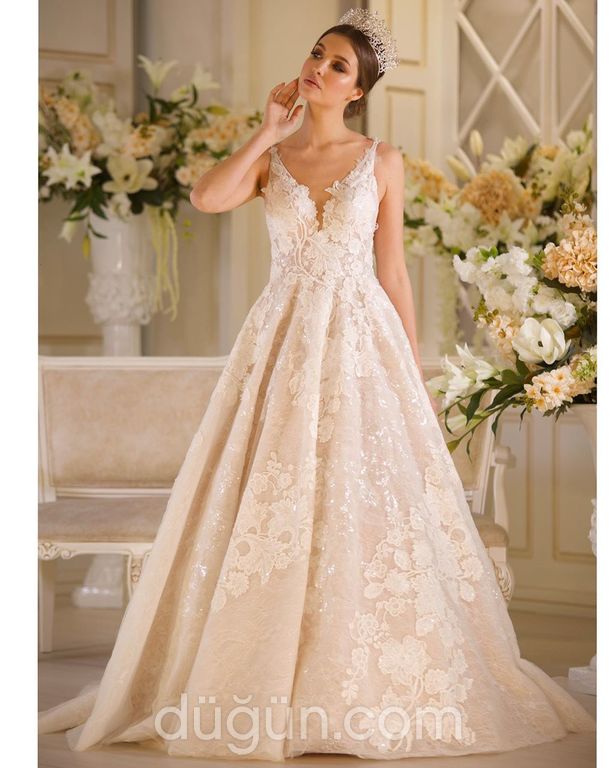 Dantel üzerinde ışıltılı tül kullanılmış, çiçek desenli dantel dizaynı kristallerle işlenmiş, önde V yaka sırt da kristal boncuk detaylarıyla fark oluşturan gelinlik