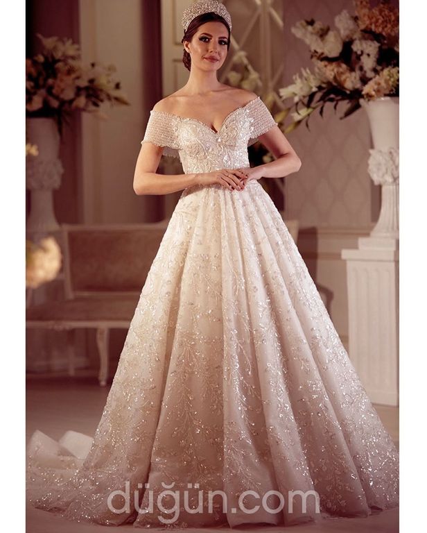 Şal omuzlu model,bedeninde payet çiçek desen işleme yapılıp aynı işleme detayı eteğinde uygulanan ışıl ışıl A kesim gelinlik