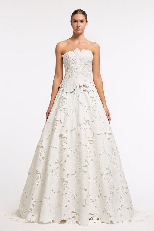 - Omuzları öne çıkaran bu straplez yaka gelinlik, özellikle açık ya da yarım toplu saç modelleri ile büyük bir uyum sağlıyor.