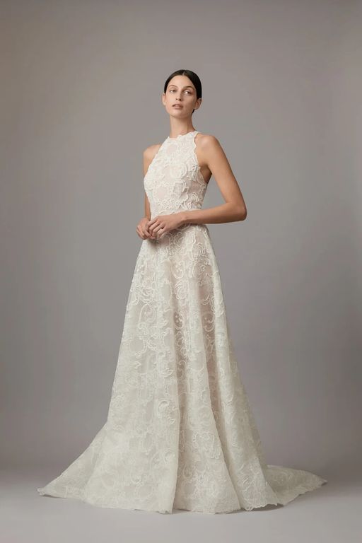 - Silüeti yukarı çeken ve vücudu formda gösteren bu halter yaka gelinlik, biçimli omuz ve kollarla muhteşem bir görüntü veriyor.