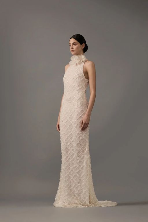 - Silüeti yukarı çeken ve vücudu formda gösteren bu halter yaka gelinlik, biçimli omuz ve kollarla muhteşem bir görüntü veriyor.