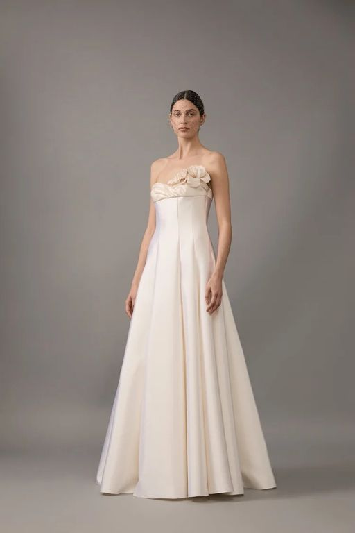 - Omuzları öne çıkaran bu straplez yaka gelinlik, özellikle açık ya da yarım toplu saç modelleri ile büyük bir uyum sağlıyor.