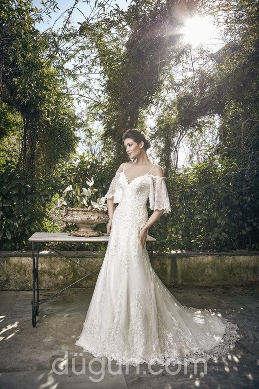 Dantel işlemeli, kollara düşen dantelli kumaş eklentisiyle düşük omuz görünümü verilmiş, sırtı ip bağcıklı gelinlik