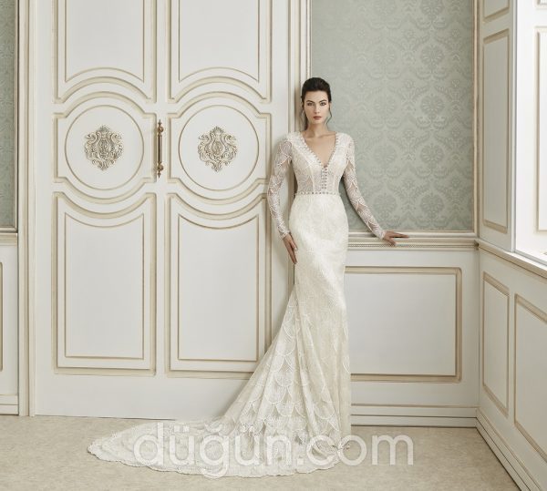 Yaka ve bel kısmı taş işleme ile hareketlendirilmiş, üst bedeni ve kolları transparan tüllü, dantel işlemeli balık kesim gelinlik