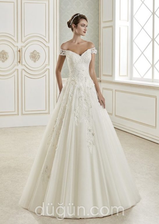 Düşük omuz, eteği yer yer kullanılan üç boyutlu dantel işlemelerle hareketlendirilmiş gelinlik