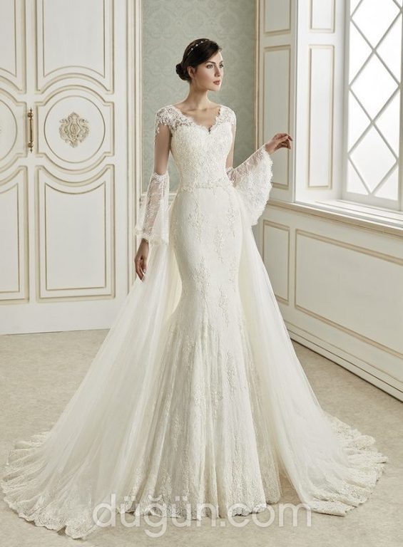 İspanyol kollu, V yaka, belden eklenebilen tül etek detaylı, balık kesim gelinlik