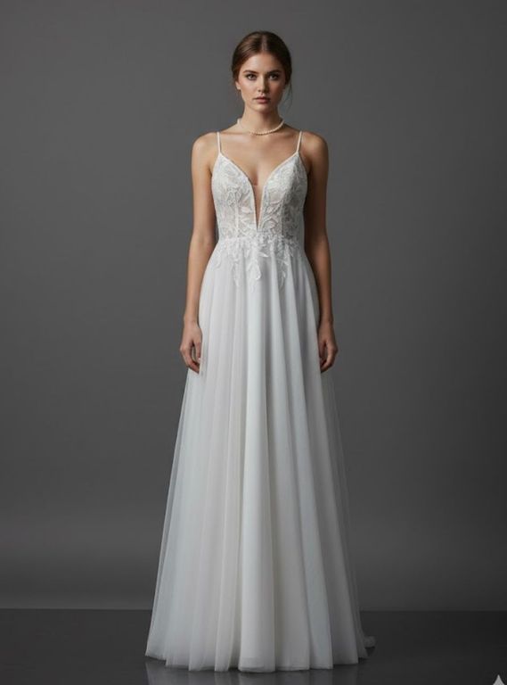Zarif ve modern duruşuyla öne çıkan A Kesim İnce Askılı Gelinlik, sade şıklığıyla büyüleyici bir etki yaratır. İnce askıları ve derin V yaka detayı feminen bir görünüm sunarken, transparan tül üzerine işlenmiş yaprak motifli dantel aplikeler romantik bir dokunuş katar. Belden aşağıya doğru dökümlü tül eteği hafif ve konforlu bir kullanım sağlarken aynı zamanda masalsı bir silüet oluşturur. Doğal ve zarif bir görünüm arayan gelinler için ideal bir seçimdir.