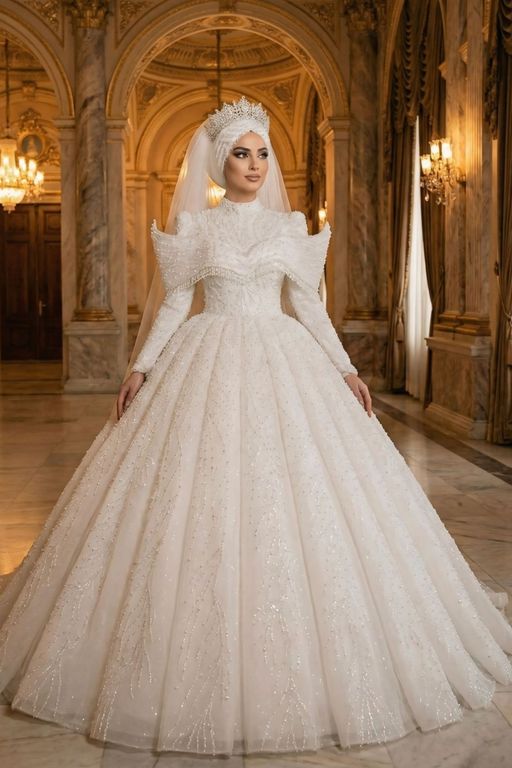 - İnce ve uzun bir boyna sahip gelinlere çok yakışan bu hakim yaka gelinlik, özellikle topuz gelin saçı ile kombinlenince çok şık bir görüntü yaratıyor.