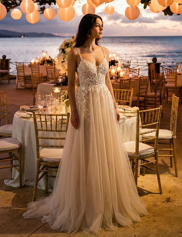Tül etekli, dantel detaylı, V yaka, askılı, A kesim gelinlik