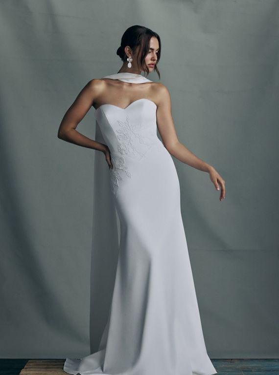 - Omuzları öne çıkaran bu straplez yaka gelinlik, özellikle açık ya da yarım toplu saç modelleri ile büyük bir uyum sağlıyor.