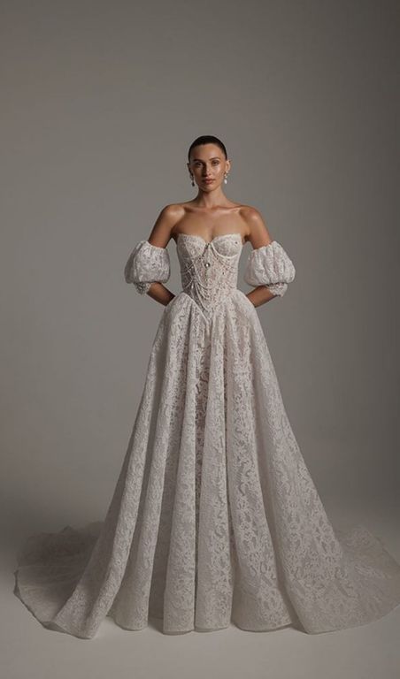 - Omuzları öne çıkaran bu straplez yaka gelinlik, özellikle açık ya da yarım toplu saç modelleri ile büyük bir uyum sağlıyor.