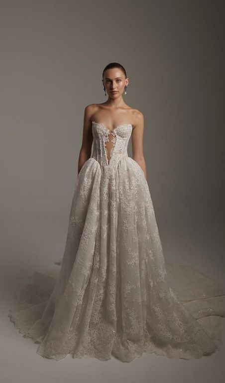 - Omuzları öne çıkaran bu straplez yaka gelinlik, özellikle açık ya da yarım toplu saç modelleri ile büyük bir uyum sağlıyor.