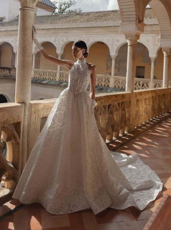 - Silüeti yukarı çeken ve vücudu formda gösteren bu halter yaka gelinlik, biçimli omuz ve kollarla muhteşem bir görüntü veriyor.