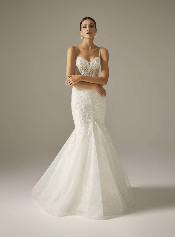- Basen bölgesini sıkıca saran balık gelinlikler, kum saati vücut tipine sahip gelinler için ideal.