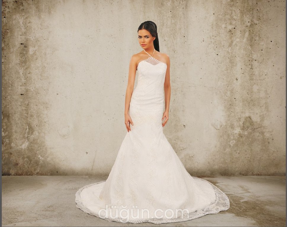 - Silüeti yukarı çeken ve vücudu formda gösteren bu halter yaka gelinlik, biçimli omuz ve kollarla muhteşem bir görüntü veriyor.