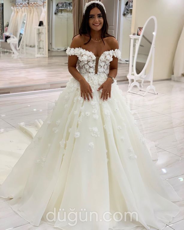 Üç boyutlu çiçek detaylarının yer aldığı, romantik esintilere sahip gelinlik.