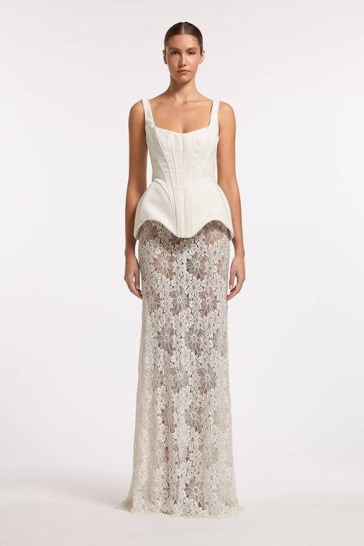 - Yakanın dik indiği bu kare yaka gelinlik, köprücük kemiği ile dekolte bölgesini öne çıkararak, zarif bir görüntü yaratıyor.