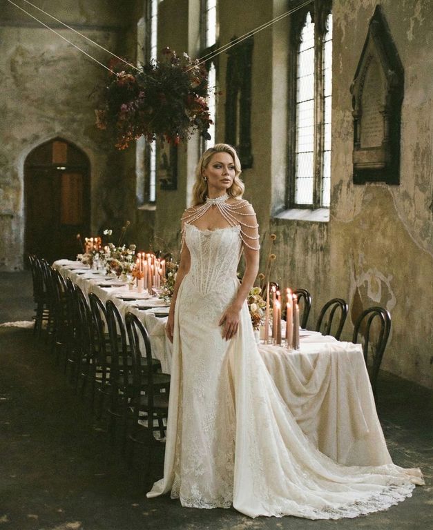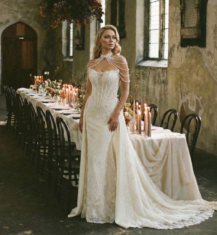 Straplez, korseli, dantelli, çıkarılabilir etekli, balık kesim gelinlik