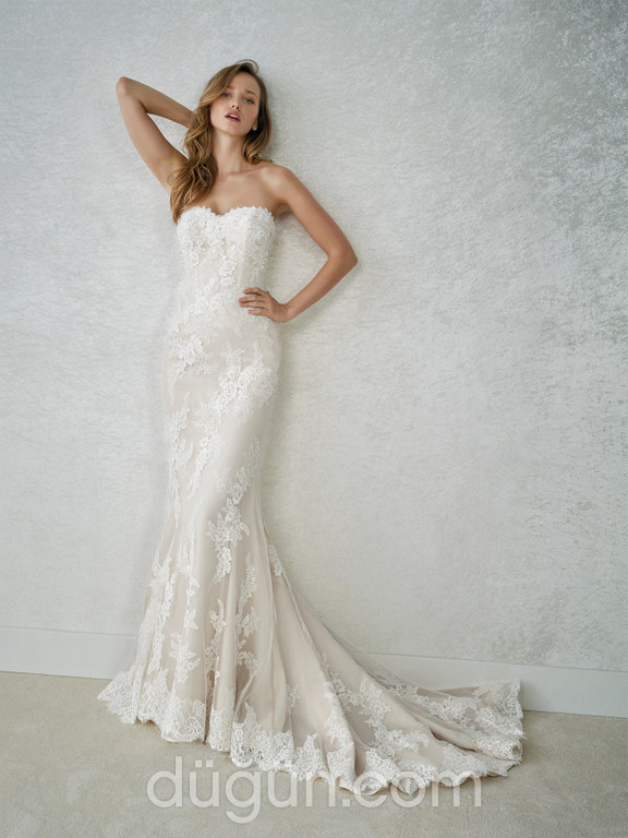- Omuzları öne çıkaran bu straplez yaka gelinlik, özellikle açık ya da yarım toplu saç modelleri ile büyük bir uyum sağlıyor.