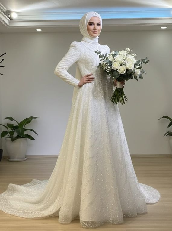 Tasarım boncuk işlemeli tesettür gelinlik