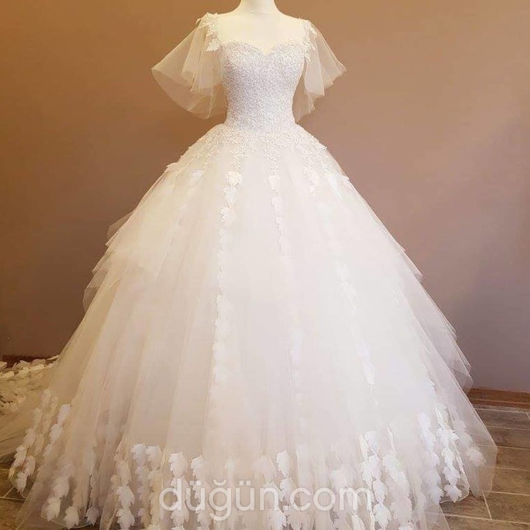 Eteği katmanlı tül, askılı kolları tülle kelebek kol görünümü verilmiş, prenses kesim gelinlik