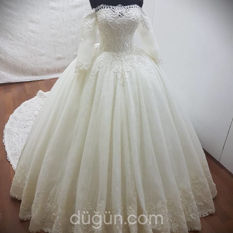 Truvakar kol, etek uçları ve üst bedeni yoğun dantel işlemeli, kabarık model gelinlik
