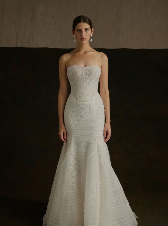 - Omuzları öne çıkaran bu straplez yaka gelinlik, özellikle açık ya da yarım toplu saç modelleri ile büyük bir uyum sağlıyor.