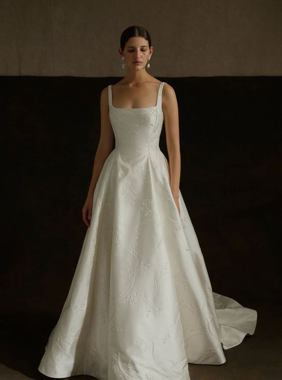 - Yakanın dik indiği bu kare yaka gelinlik, köprücük kemiği ile dekolte bölgesini öne çıkararak, zarif bir görüntü yaratıyor.
