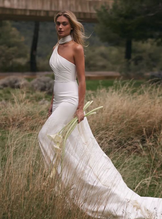 - Dikkati üst bedende yoğunlaştıran tek omuzlu bu gelinlik, özellikle dağınık topuz gelin saçı ile mükemmel bir uyum yakalıyor.
