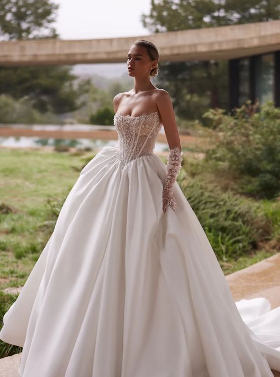 - Omuzları öne çıkaran bu straplez yaka gelinlik, özellikle açık ya da yarım toplu saç modelleri ile büyük bir uyum sağlıyor.