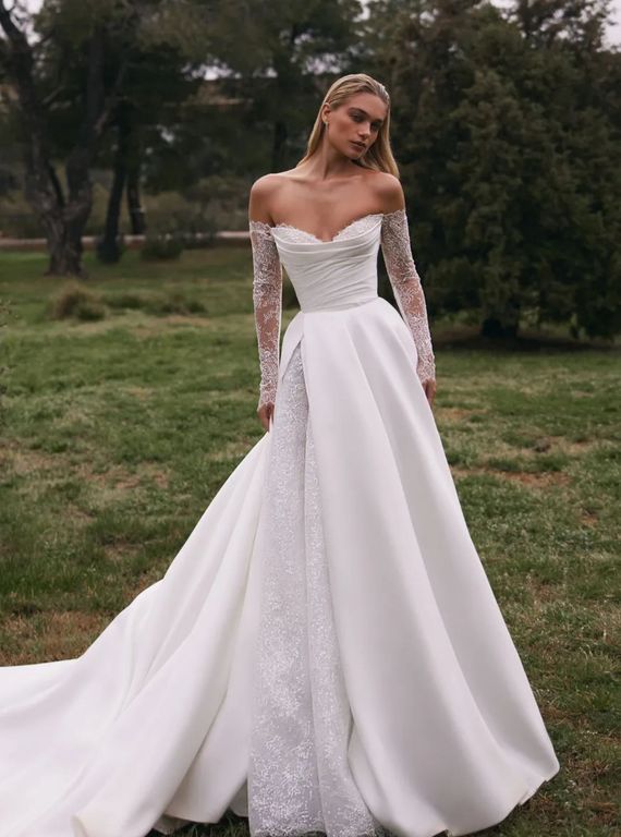 - En çok tercih edilen yaka tiplerinden bu düşük omuz gelinlik, özellikle dar omuzlu gelinlere çok yakışıyor.