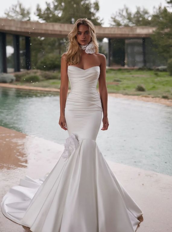 - Omuzları öne çıkaran bu straplez yaka gelinlik, özellikle açık ya da yarım toplu saç modelleri ile büyük bir uyum sağlıyor.