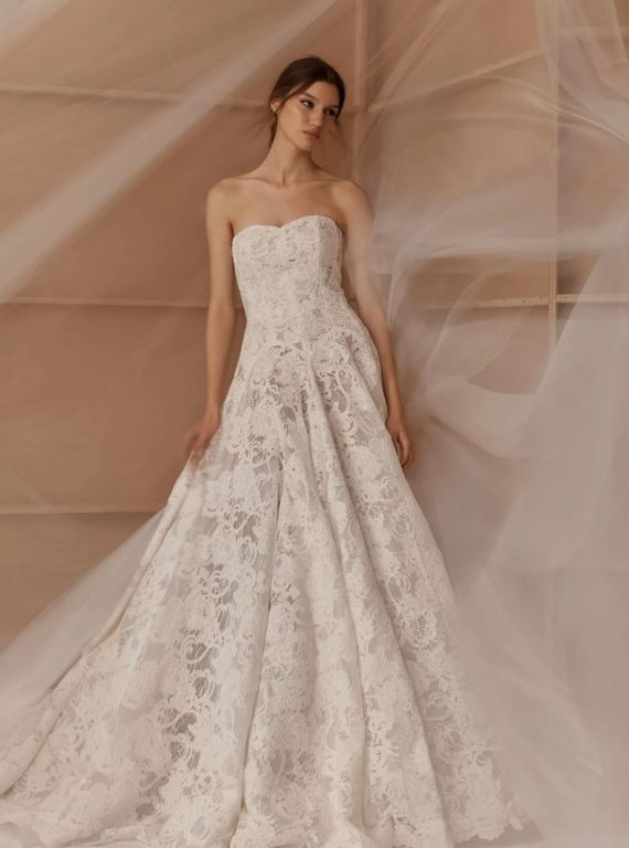 - Omuzları öne çıkaran bu straplez yaka gelinlik, özellikle açık ya da yarım toplu saç modelleri ile büyük bir uyum sağlıyor.
